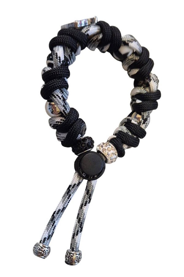 Zwart met zwart/witte koord gemixt met bling bling en zilveren kralen met ras naar keuze.