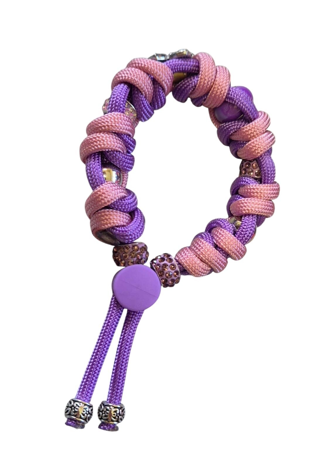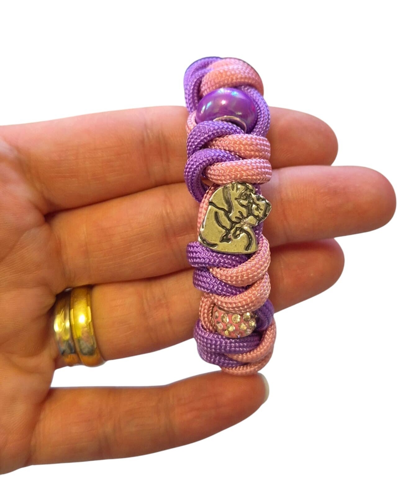 Armband paars en rose koord gemixt met bling bling en zilver kralen met ras naar keuze