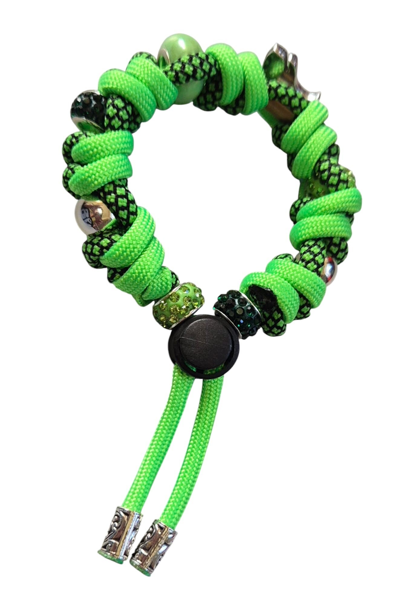 Armband in neon groene koord gemixt met bling bling en zilveren kralen met ras naar keuze